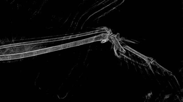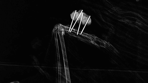 This was taken intraoperatively, as you can see owl’s body overlying the wavy heating element of the heat pad. Because it can sometimes be difficult to correlate what is palpable to actual bone orientation, the surgical clamp seen was used as a landmark. Comparing its physical location to what is seen on the radiograph can help improve alignment.