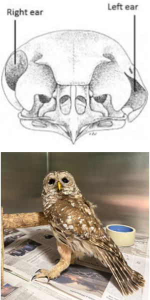 Owls rely heavily on their hearing when hunting. In many owl species, the ear openings are not symmetrical.