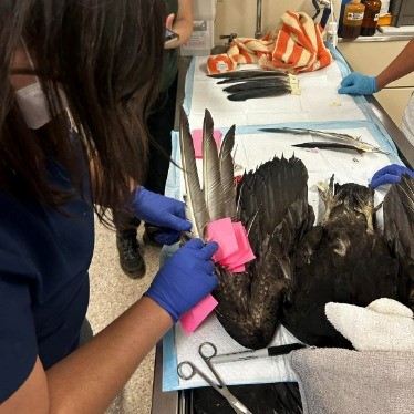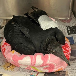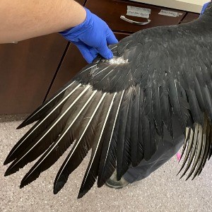 This first year Black Vulture was brought into care after being found down and unable to fly. Exam revealed the reason why—the flight feathers on the left wing were completely singed, preventing flight. They were also covered in ectoparasites, dehydrated, and very skinny, all signs they were not doing well as a result of the flight loss.