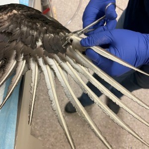 Luckily, we had a full set of primaries collected from a deceased donor Black Vulture in our feather catalog—feathers must in good condition, species specific, and labeled (regarding order on the wing, type of feather, etc.) in order to be useful. Donated feathers are only placed in the exact position of the destroyed feather, so it is very important to have the right feather!