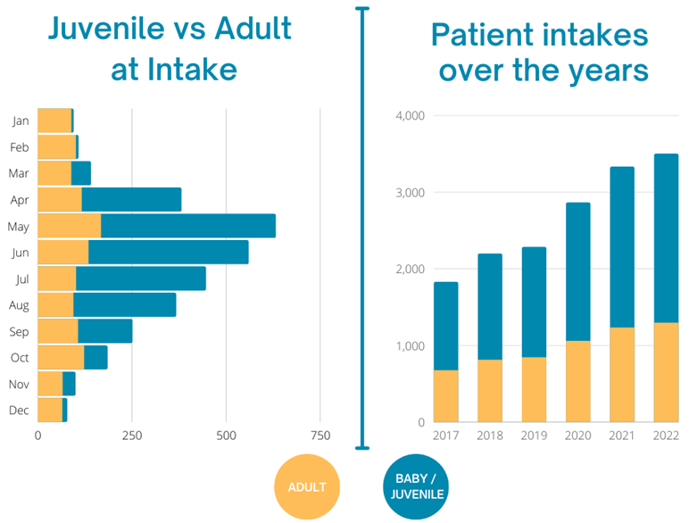 Each year, our patient load increases, with babies and juveniles making up over 60% of the total intakes.