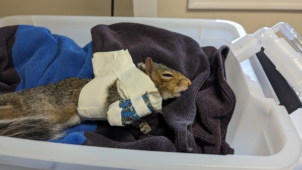 Cue the Jaws theme for a squirrel with a shark fin-shaped bandage! This young male Eastern Gray Squirrel was brought into care after the finder noticed him limping on the front right leg. Radiographs revealed a broken radius (one of the forearm bones) most likely due to a cat attack, given the cat-sized puncture wound over the fracture site.
