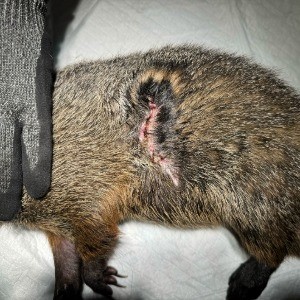 This Groundhog was admitted after a vehicle collision left her with exposed small intestines that had herniated through the left abdominal wall.