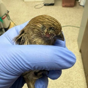 This female House finch patient is suffering from mycoplasmosis or “finch eye disease”, an infection caused by the bacterium Mycoplasma gallisepticum (similar to pink eye in people). This bacterium causes eye swelling and discharge, leading to temporary blindness, which then leaves these birds vulnerable to predation and prevents normal foraging.