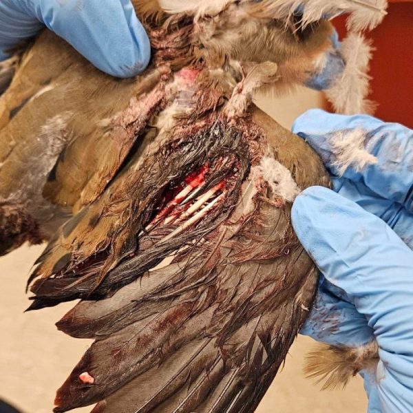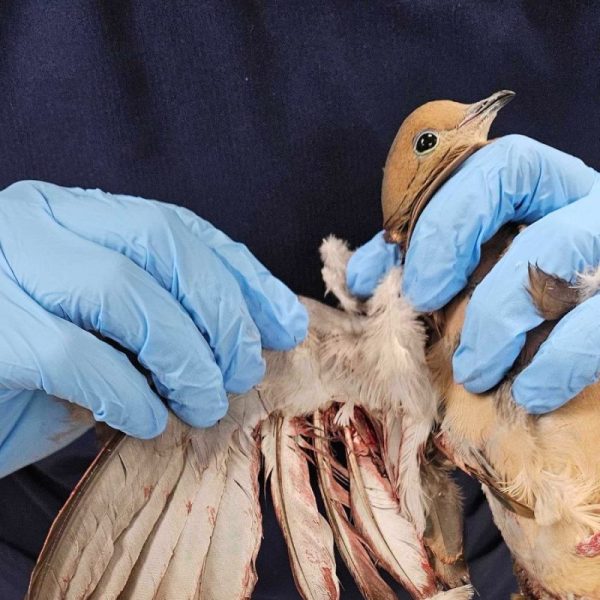 Thankfully, this patient’s injuries were treatable. The dove arrived with soft tissue trauma and skin tears, along with significant feather damage. While the wounds are healing well, the feather loss means this bird will need an extended stay with us. Until those feathers regrow properly, flight is not possible, and release is not safe.