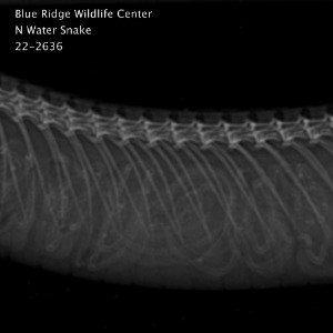 Radiographs taken to assess tail damage also revealed that this snake will soon be a mom! Northern water snakes are viviparous, meaning that they give birth to live young rather than laying eggs. This species gives birth this time of year and can have litters of up to 50! We are hopeful that we will be able to release this snake before she gives birth so that her babies can be born in the wild.