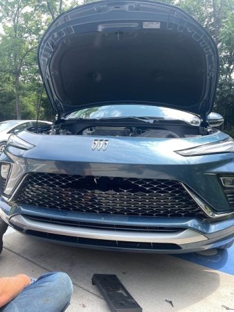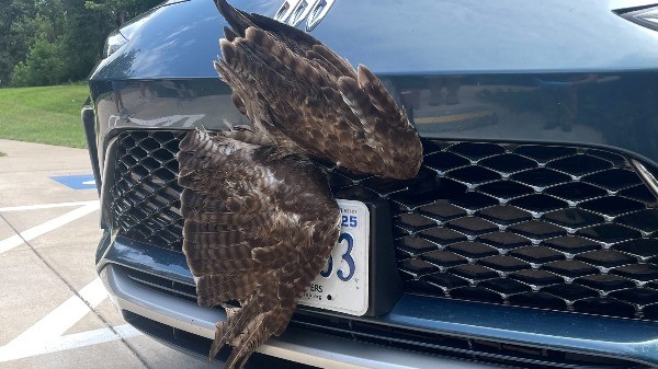 A driver called us after accidentally striking a Red-tailed Hawk while on the road. When they pulled over to check on the bird, they realized the hawk wasn’t on the ground… it was wedged into the front grille of their car.