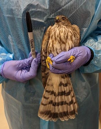 You may be surprised by the size of this mighty hawk, which is around the size of a mourning dove (photo shows another one of our Sharp-shinned patients with a Sharpie, for scale.)