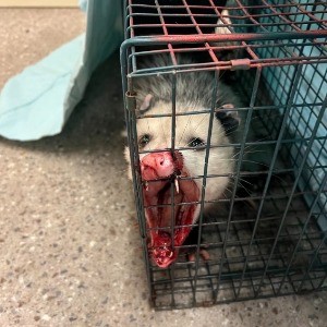 This male Virginia Opossum, an unintended victim, ended up in the trap overnight. His upper and lower jaws were completely stuck on the cage bars, as he attempted to bite himself out. Thankfully, the homeowner brought the entrapped opossum to us for emergency care.