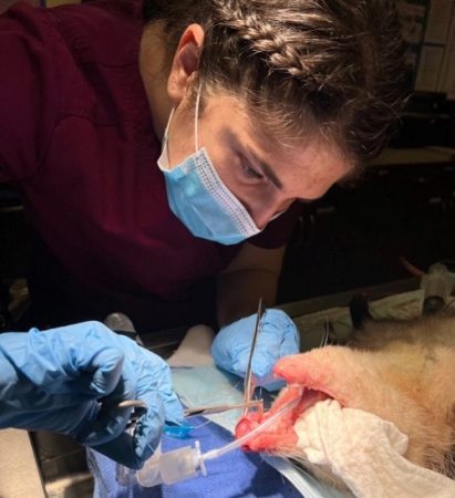 After flushing the wounds, areas that were safe to close were surgically repaired and other areas were left open to heal. Luckily, oral wounds tend to heal quickly thanks to saliva’s antibacterial properties and rapid cell turnover in that area!
