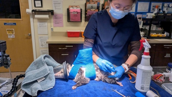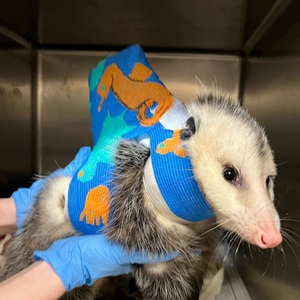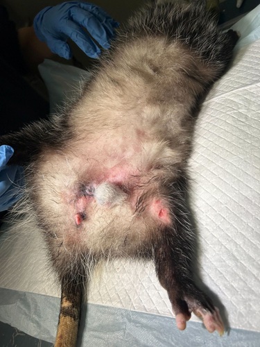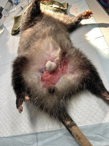 To protect the surgical site, we applied a creative “shark fin” bandage, a method we have found particularly effective for opossums.