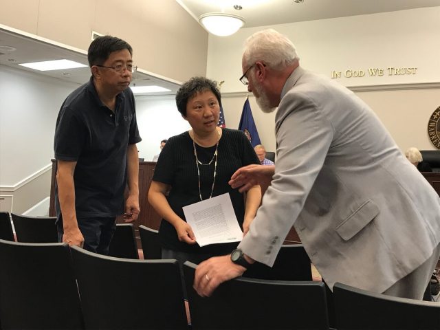 Gang Li (left) and Helen Xiaohui Wu (center) discuss their variance request with Warren County Floodplain Manager and Planner II Matt Wendling (right). Photo by Kim Riley