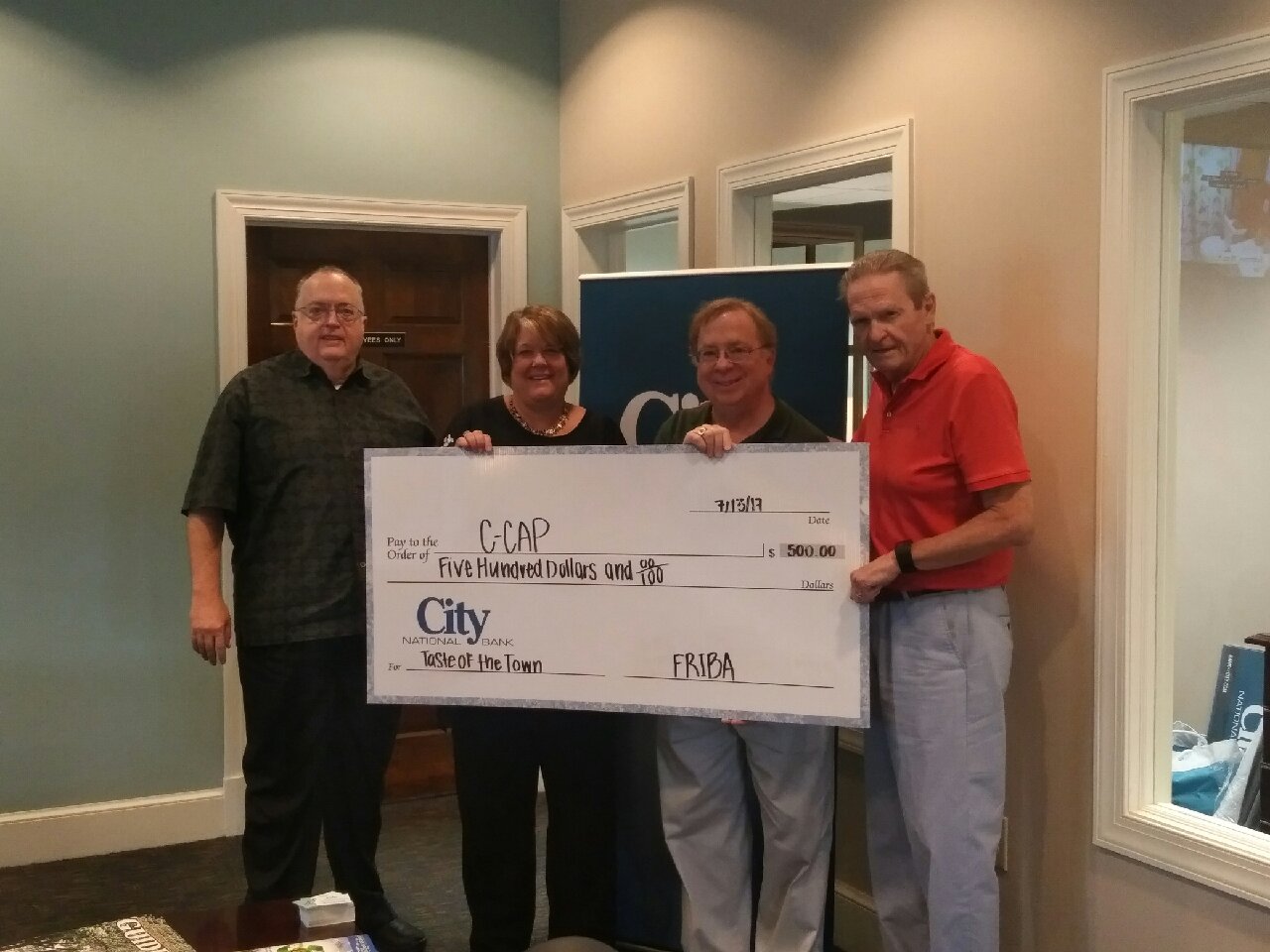 The Front Royal Independent Business Alliance (FRIBA) on Friday gathered at the City National Bank to present the Congregational-Community Action Project of Front Royal/Warren County (C-CAP) with a $500 check.