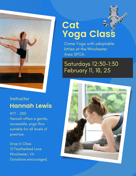 Come Yoga with adoptable kitties at the Winchester Area SPCA! On Saturdays in February, drop by the WASPCA Adoption Center at 111 Featherbed Lane. Classes start at 12:30PM. You chose the donation.