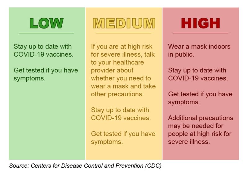 Along with the county-level tracker, the CDC released guidelines for counties depending on their COVID-19 level. For communities with low and medium levels, masks are not mandatory inside, unless an individual is part of an at-risk group. For communities with high levels, masks should continue to be worn indoors in public.