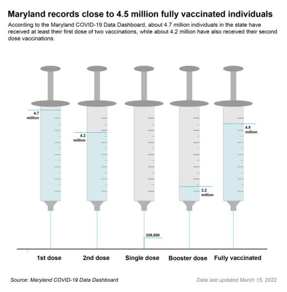 As of March 15, there were about 4.5 million fully vaccinated individuals in Maryland. An estimated 4.7 million people have received at least their first vaccination of two.