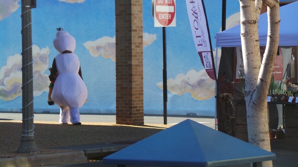 A snowman appears to be lost in the Clouds at East Main’s intersection with Cloud Street. Perhaps he is wondering if he will melt if he leaves his storefront shade to ‘touch the sky’ (with yet another Cloud St. mural lyrical nod to Jimi Hendrix).
