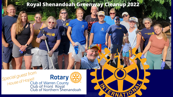 What a great morning we shared in Front Royal on Saturday, July 2nd, with like-minded neighbors and friends. All three of our local Rotary clubs came together (Rotary Club of Warren County, Rotary Club of Northern Shenandoah, Rotary Club of Front Royal) to clean up litter along the Royal Shenandoah Greenway joined by like-minded community members, youth, and a special guest from House of Hope – Front Royal, VA.