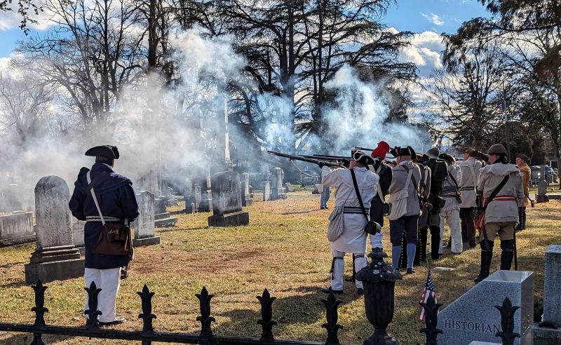 Virginia Society State Musket Squad is firing a salute to Daniel Morgan. The musket squad led by Commander Brett Osborn and Vice Commander Ken Bonner, comprised of 11 compatriots, fired a three-round salute in honor of Daniel Morgan and his decisive victory over the British at the Battle of the Cowpens. (photo courtesy of Stacey Bassett.)