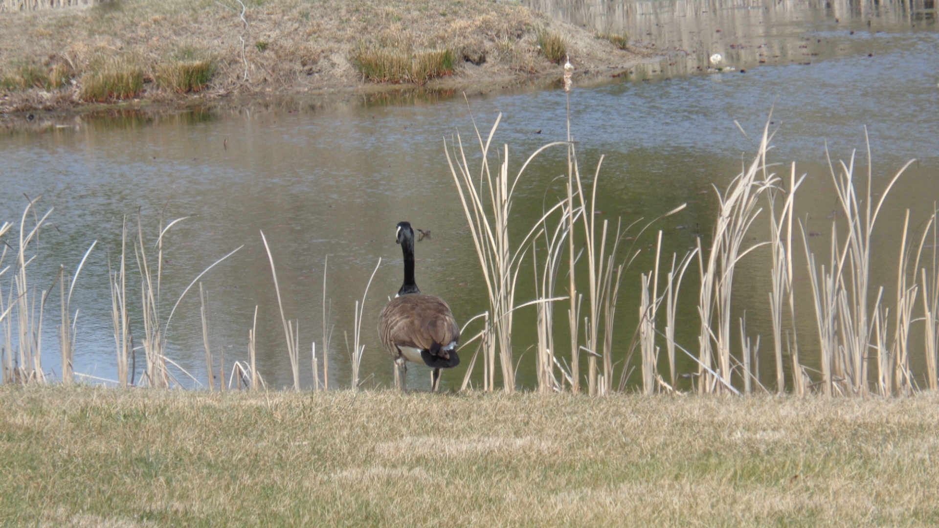 A goose, pond side at Panorama Memorial Garden on March 13, ponders his next step into often chilly waters.
