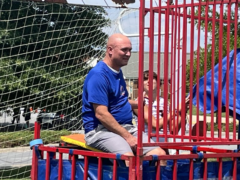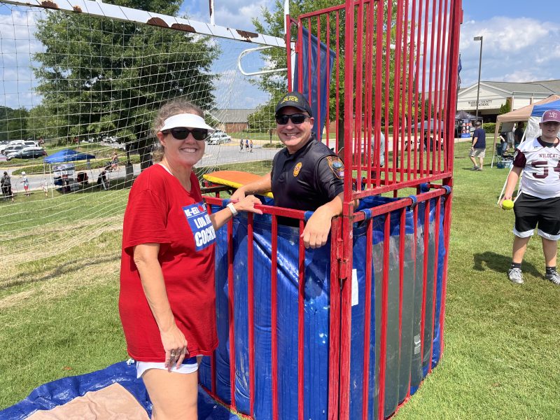 Above: Mayor Lori Cockrell, fresh out of the dunking tank, stands beside FRPD Chief Kahle Magalis as he takes his turn. Below: Superintendent Christopher Ballenger prepares to be dunked.