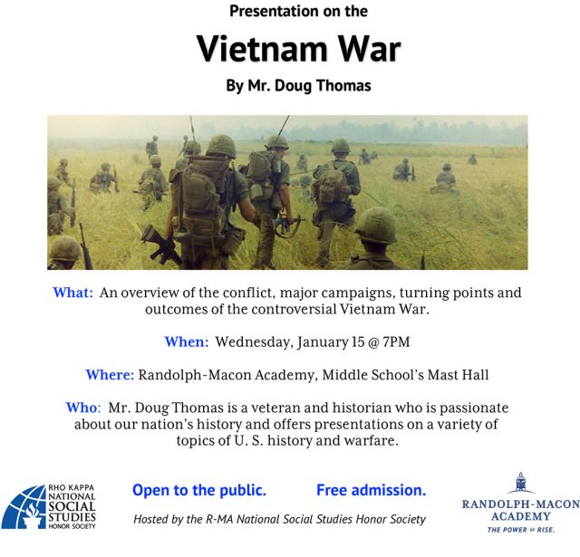On Wednesday, January 15th at 7:00 pm, Randolph-Macon Academy (R-MA) will host Doug Thomas for a presentation on the Vietnam War, providing an overview of the conflict, major campaigns, turning points, and outcomes. The presentation will be held in Mast Hall, which is part of the Middle School campus at R-MA.