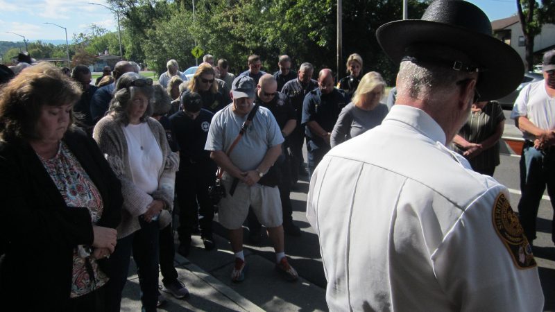 WCSO’s Roger Vorous, back to the camera, gave the invocation to a solemn crowd gathered in memory of FRPD Sgt. Dennis Smedley, a brother, a son, a friend, and an officer in service to his community.