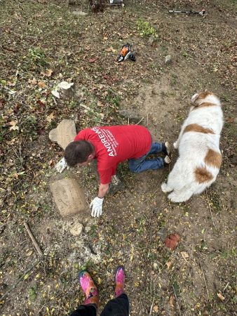 A closer look at downed tombstones; and below, Joe Andrews and canine assistant at work on Oct. 29, helping clean up and restore the site.