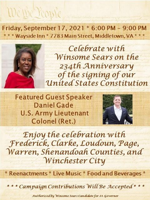Join Winsome Sears to celebrate the 234th anniversary of our United States Constitution and honor our men and women in the U.S. Military.