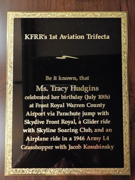 Royal Examiner was alerted to a special recognition of a recent birthday celebration, “Trifecta” of aviation-related activities available at the County-overseen Front Royal Airport (FRR). The recognition of airport patron Tracy Hudgins was scheduled for the September 10th meeting of the Front Royal Airport Commission. Given contact information for Hudgins by Skyline Soaring Club/Airport Commission member Erik van Weezendonk, we contacted Ms. Hudgins about her airport-based birthday celebration.