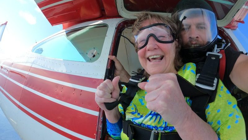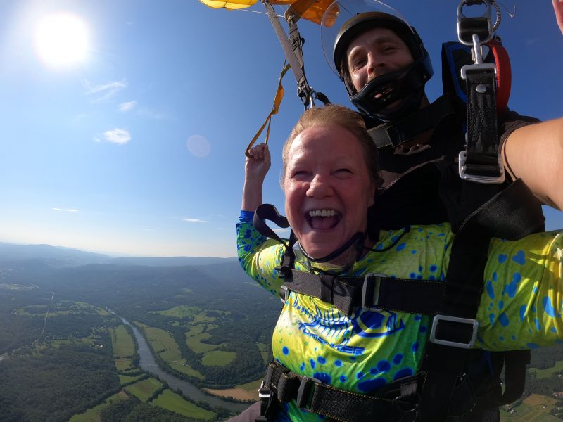 And it’s up and off for the most adrenaline-pumping of her three aerial trips aloft to celebrate her July birthday, the skydive. Hudgins credits Skydive Front Royal jumping partner Alfredo Basile, who handled the airborne photo assignment, for getting her down safely for the third year in a row.