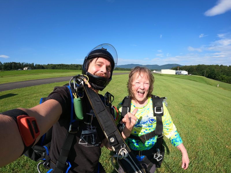 “I often refer to my adventures in chapters. The Trifecta at the Front Royal/Warren County Airport is part of my Chapter 64 celebration. I celebrate life all year,” Hudgins told us of a positive outlook fueled by her gaining control of an emerging health issue as she moved toward that Chapter 64 experience. But this wasn’t her first post-weight loss skydive, she told us. It was, however, her first aerial birthday “Trifecta”.