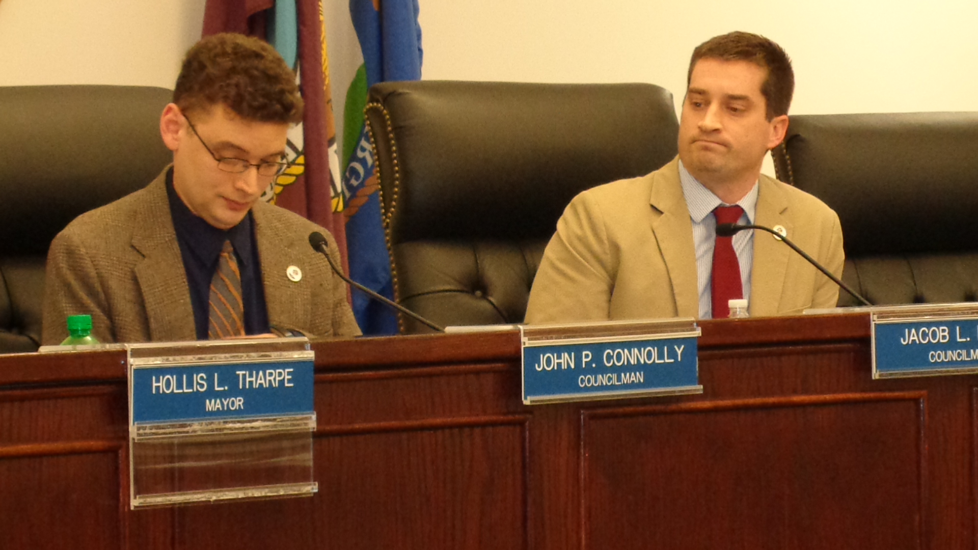 Jacob Meza, right, listens as John Connolly explains his motion to appoint Christopher Morrison to replace Hollis Tharpe on Council. Photo/Roger Bianchini