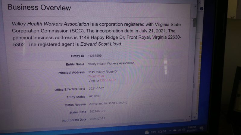 On Aug. 25, Thompson posted screenshots of online documentation on the creation of the Valley Health Workers Association, with listed Registered Agent Edward Scott Lloyd, on July 21, five days before the first vote on Lloyd’s initial Emergency Ordinance seeking to halt employer vaccine mandates in the town limits. Below, Lloyd is among the listed officers of the group.