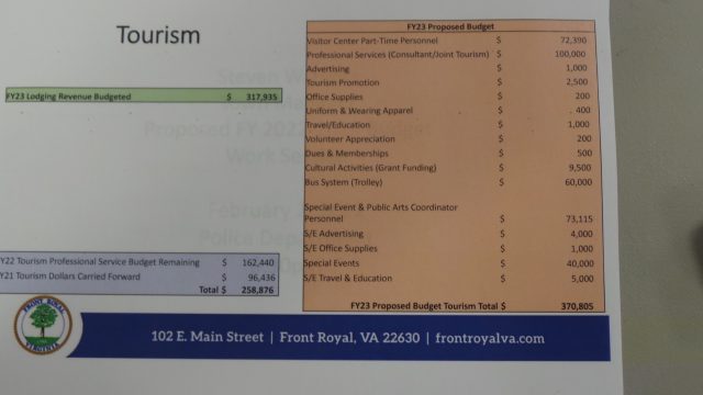 Under the watchful eye of the Royal Examiner camera manned by Mark Williams, upper right, the Front Royal Town Council and staff prepare for a lively budget and tourism operational discussion. Below, early page in the JLL FY23 tourism budget presentation.