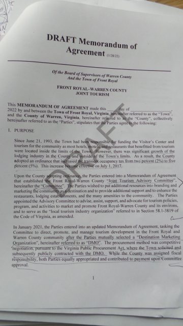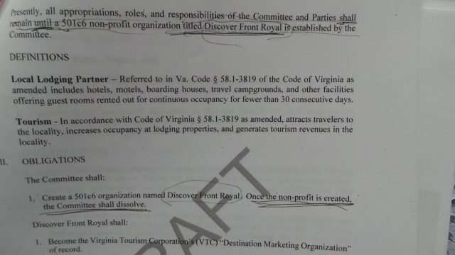 Page one of the Joint Tourism MOA – everything seems in place. Uh oh, from the top of page 2, below, with the advent of a 501c6 non-profit to essentially take over all tourism authority and operational decisions, not to mention the “Discover Front Royal” brand, the discussion got interesting and lively.