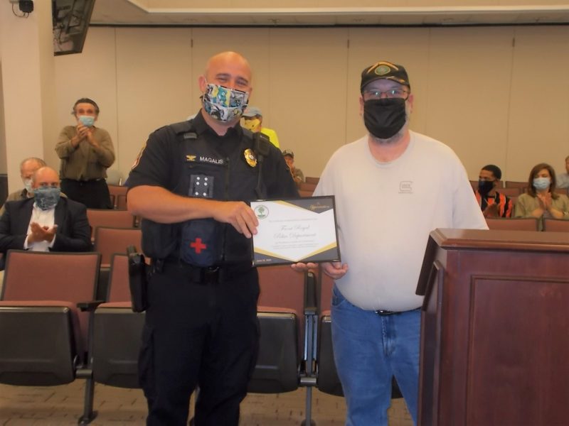 Paul Aldridge presented Chief Magalis with a plaque acknowledging the chief and his department’s positive contributions to the community; while Edward Irre commended the “courteous” behavior of a patrol officer while giving him a ticket for admittedly “breaking a traffic law”. – “That is why he got that award tonight,” Irre observed of the department’s professionalism from top to bottom. Irre also noted repeated excellence in public works and utility service responses over recent years.