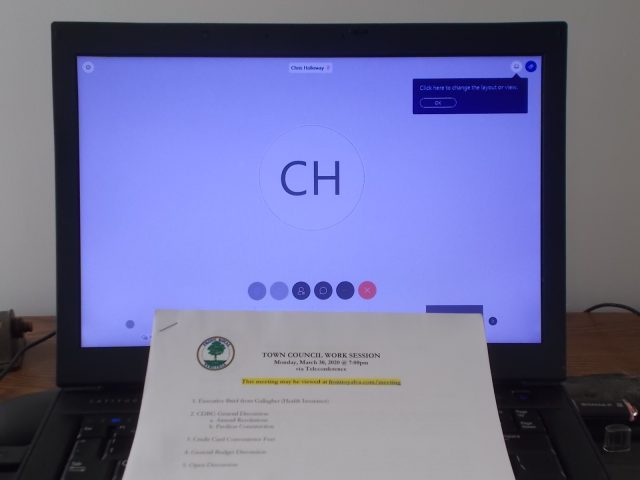 ‘CH’ – Gallagher’s Cheri Herschman – tried to open the council’s March 30th virtual work session with an employee health insurance presentation. However, her audio hook up experienced issues, leading to her getting bumped to second on the agenda. Royal Examiner File Photos/Roger Bianchini – Royal Examiner Audio/Mike McCool