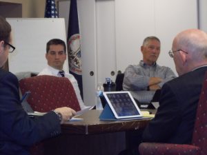 Councilman Jake Meza and William Sealock, Jr. (flanked by Interim Town Manager Joe Waltz and Town Attorney Doug Napier) discuss issues at Tuesday evening’s work session. Photo by Norma Jean Shaw