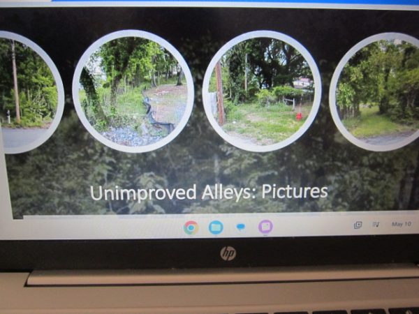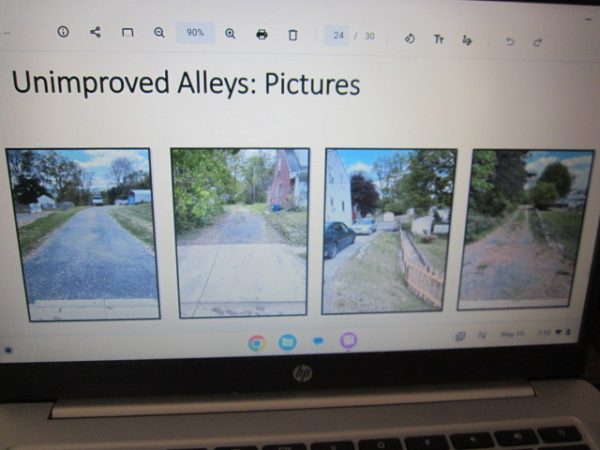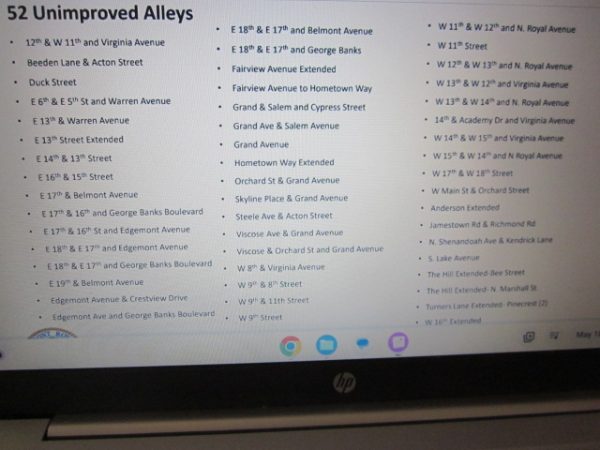 Visual images of staff’s survey of what was counted at 52 unimproved alleyways in the town limits presented by Public Works Director Robbie Boyer. Final image below is the full list of those alley locations – see your neighborhood in there anywhere? A council consensus was to proceed with an annual inspection program encouraging citizen participation in the upkeep of unimproved alleys near their properties.