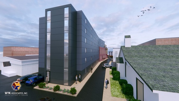 Two views of the old Murphy Theater building and applicant’s rendering of rebuild. The oldest sections are the commercial addition facing East Main, added in 1908/09, and the original Methodist Church section dating to 1879, which is the darker bricked section behind the E. Main commercial addition that goes two windows back along Church St. The lighter terra cotta (believed dating to 1920s) and rear apartment section (circa 1940s or ’50s) are the targeted for demolition portions of the building.
