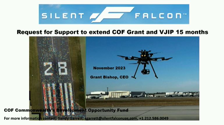 Va. Regional Transit Central District Manager Michael Socha opened the work session with an upbeat update on the ‘Corridor Connector’ town to county bus transportation operation (2:10 video mark). Below, Silent Falcon CEO Grant Bishop followed with a report on his company’s changing operational focus and its potential from coupling drone and A.I. technologies to improve airport inspections and safety standards, which Silent Falcon appears to stand at ground zero of (14:20 video mark).