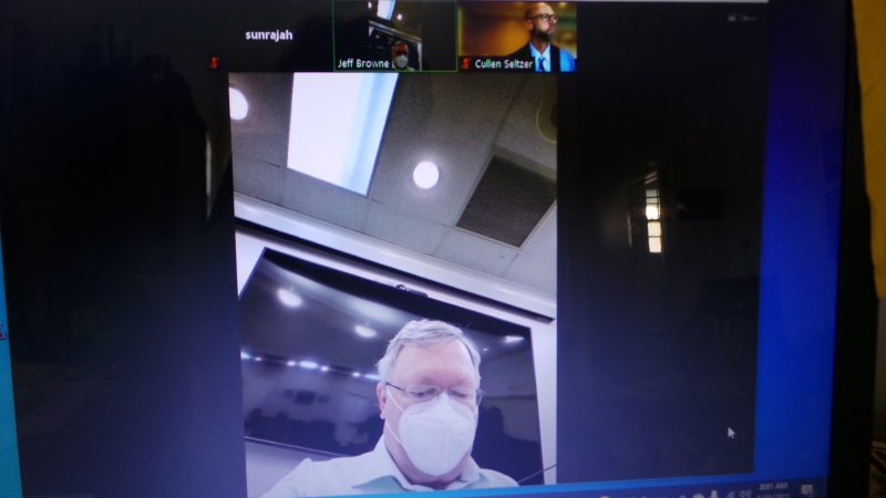A masked Jeff Browne chairs the EDA Board’s first in-person meeting in over a year at the WCGC, as what he termed a ‘hybrid’ meeting which was ZOOM broadcast prepares to go into closed session at 8:10 a.m.