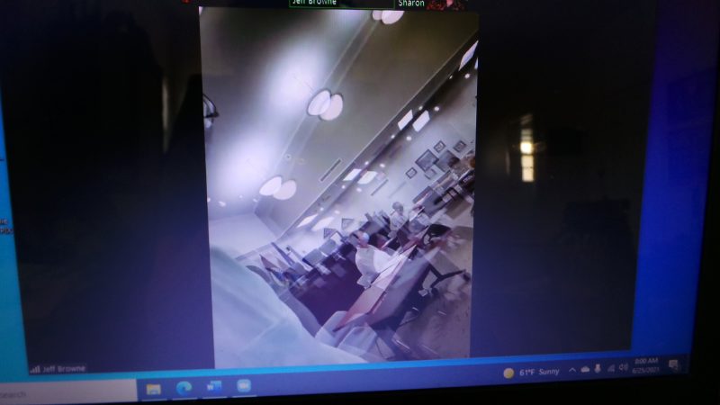 A little ZOOM phone orientation issue as the EDA Board convenes at 8 a.m. in the WCGC’s main meeting room. The meeting soon adjourned to a closed session in the adjacent caucus room, where the remainder of the closed and open sessions were held.