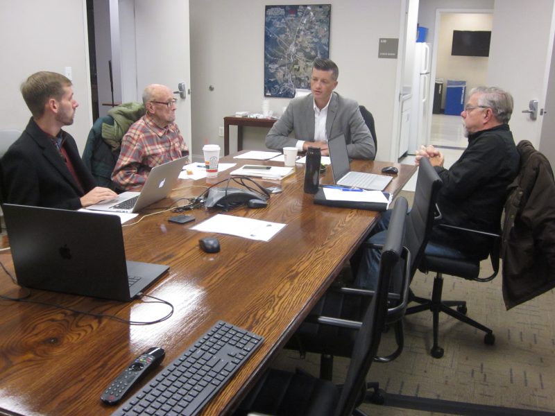 FR-WC EDA Board Chairman Rob MacDougall, standing left, talks with Front Royal Town Manager Joe Petty, also standing, during meeting break. Also present from the town government was Councilman Glenn Wood.