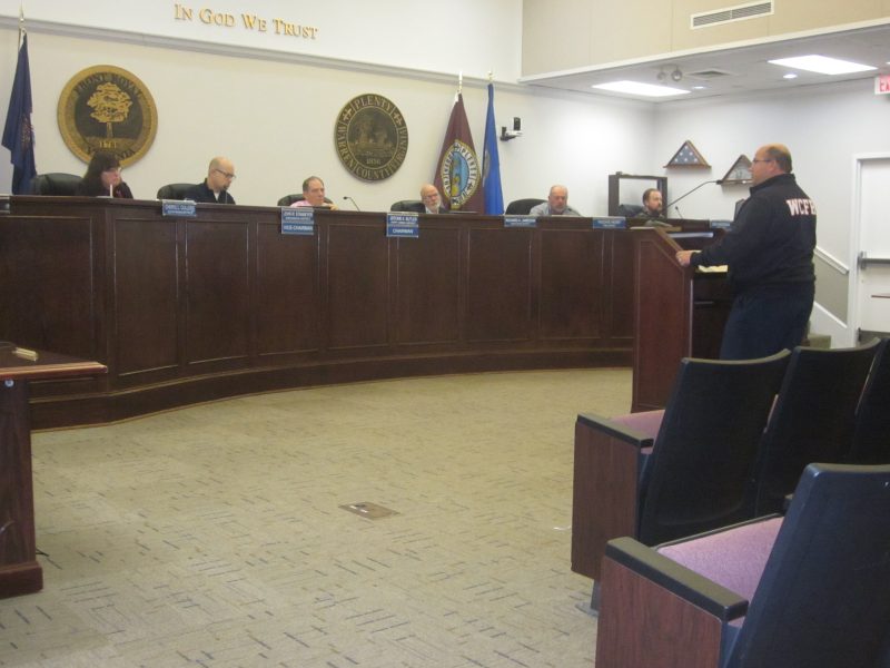 WC Fire & Rescue Assistant Chief Gerry Maiatico at the podium addresses the financial implications of the timing of County funding of the acquisition of 2 new Ambulance Transport Units. The only concern expressed by dissenting approval voters, Cheryl Cullers and Hugh Henry, was the source of those purchases being money originally committed to operational funding of Samuels Public Library.
