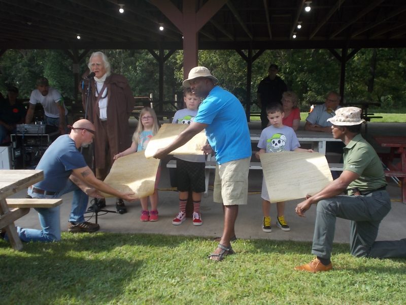 Above, new WC Republican Committee Chairman John Smith, blue shirt, and Republican Attorney General candidate Chuck Smith, kneeling at right, and third man help unfurl a replica of the U.S. Constitution for children to hold as ‘Liberty Man’ Larry Johnson addresses the document’s importance to ‘militia muster’ crowd. Below, the VFW pavilion where activities were centered. Royal Examiner Photos by Roger Bianchini