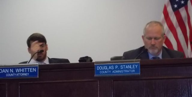 County/EDA Attorney Dan Whitten, left, and County Administrator Doug Stanley absorb some public critique of a perceived lack of municipal oversight of how the EDA was using county taxpayer money. Royal Examiner Photos/Roger Bianchini