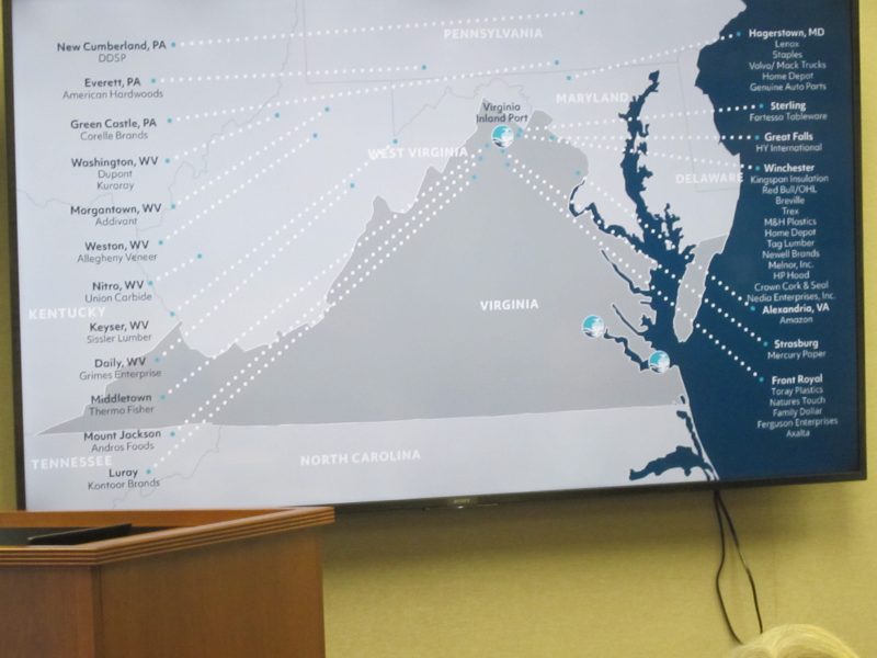 Virginia Port Authority officials Chris Gullickson and Cathie Vick highlight how the ‘Virginia model’ of port network operations beat the supply chain crisis of recent years. The final shot from PowerPoint highlights some destinations from Warren County’s Virginia Inland Port.