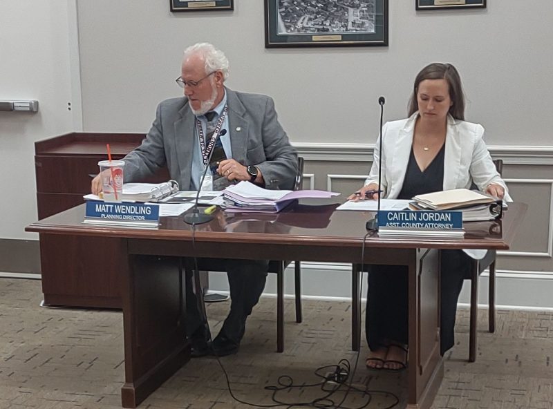 Planning Director Matt Wendling, left, outlines the Zoning Ordinance Text amendment that has been the subject of much discussion by both County and Town governments regarding permitting Data Centers. To Wendling’s right, Assistant County Attorney Caitlin Jordan keeps everyone on track with the legal parameters of issues.